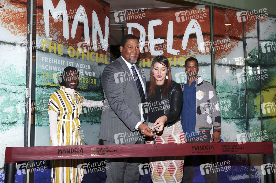 Ivy Quainoo, Zwelivelile Mandla Mandela mit Ehefrau Raabia Clarke und Patrice Bouedibela beim Photocall zur Ausstellungseröffnung 'Mandela: The Official Exhibition' im Bikini Berlin. Berlin, 18.10.2019