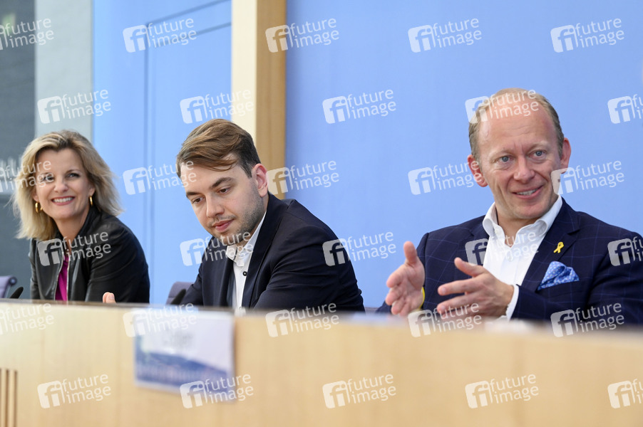 Daniela Ludwig, Philip Krämer und Carsten Ovens bei der Bundespressekonferenz Israel Survey 2024 - Eine vergleichende Analyse politischer Positionen von Abgeordneten aus 29 europäischen Nationen sowie den 16 deutschen Landtagen zur Nahostpolitik und zum jüdischen Leben in Europa im Haus der Bundespressekonferenz. Berlin, 27.06.2024