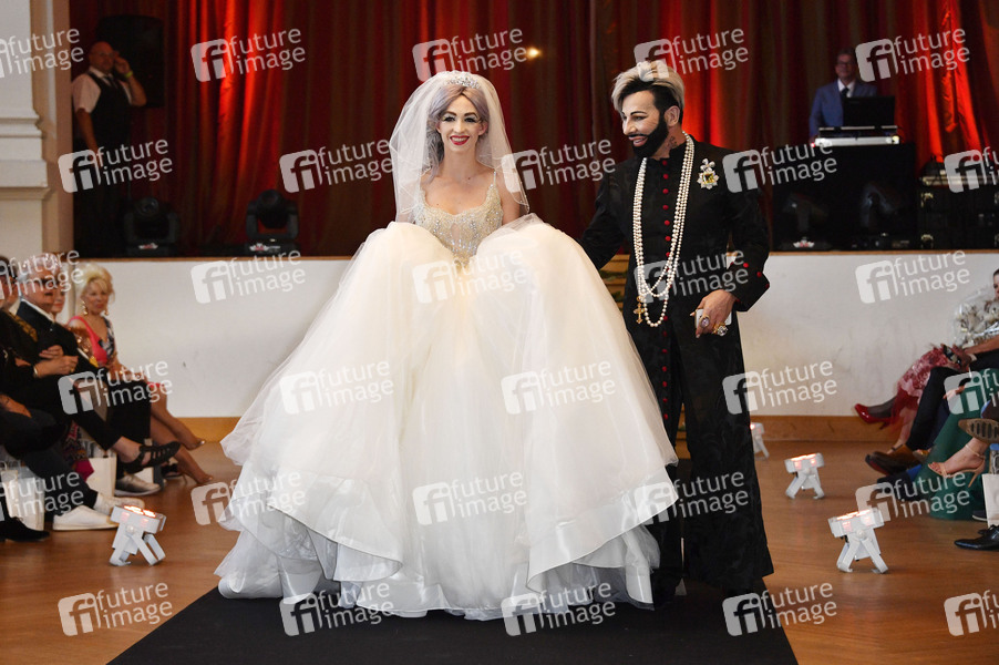 Harald Glööckler mit Model bei der Präsentation der Brautmodenkollektion Pompöös by Semiha Bähr im Ballhaus Pankow. Berlin, 28.06.2019