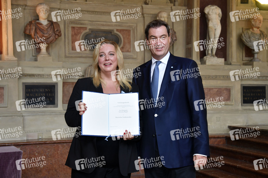 Katharina Wagner und Markus Söder bei der Verleihung des Bayerischen Verdienstordens 2019 im Antiquarium der Münchner Residenz. München, 22.07.2019
