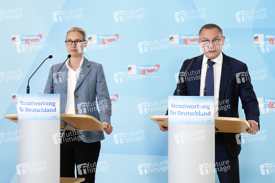 Politik, Statement, Pressekonferenz, PK, Reichstag, Deutscher Bundestag, Demokratie, Parlament, Parlamentsgebäude, Volksvertreter, MdB, Mitglied des Bundestages, Abgeordnete, Politikerin, Bundessprecherin der AfD, Abgeordneter, Politiker, Bundessprecher der AfD, Vorsitzende der AfD-Bundestagsfraktion