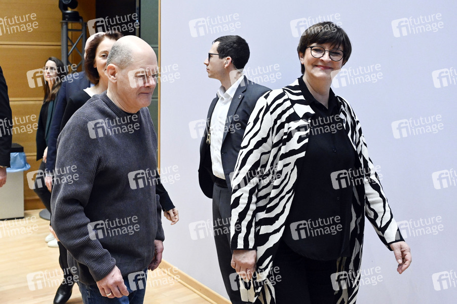 Olaf Scholz und Saskia Esken bei Beratungen im Rahmen einer Klausur des SPD-Parteivorstandes in der Landesvertretung Hamburg beim Bund. Berlin, 16.03.2024