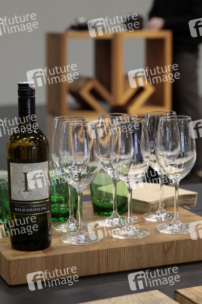 Weinglastablett aus Massivholz beim Presserundgang zur Eröffnung der imm cologne - World of Interiors, der Fachmesse für Möbel und Innenraumgestaltung, in der Koelnmesse, Köln, 20.01.2026