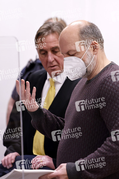 Der Angeklagte Thomas Drach mit seinem Rechtsanwalt Andreas Kerkhof bei seinem Strafprozess vor dem Kölner Landgericht. Der 61-jährige frühere Reemtsma-Entführer soll vier Geldtransporter in Köln, Frankfurt am Main und Limburg überfallen haben. Die Anklage lautet unter anderem auf versuchten Mord und besonders schweren Raub. Der Prozess findet unter aufwendigen Sicherheitsvorkehrungen statt. Köln, 07.02.2022