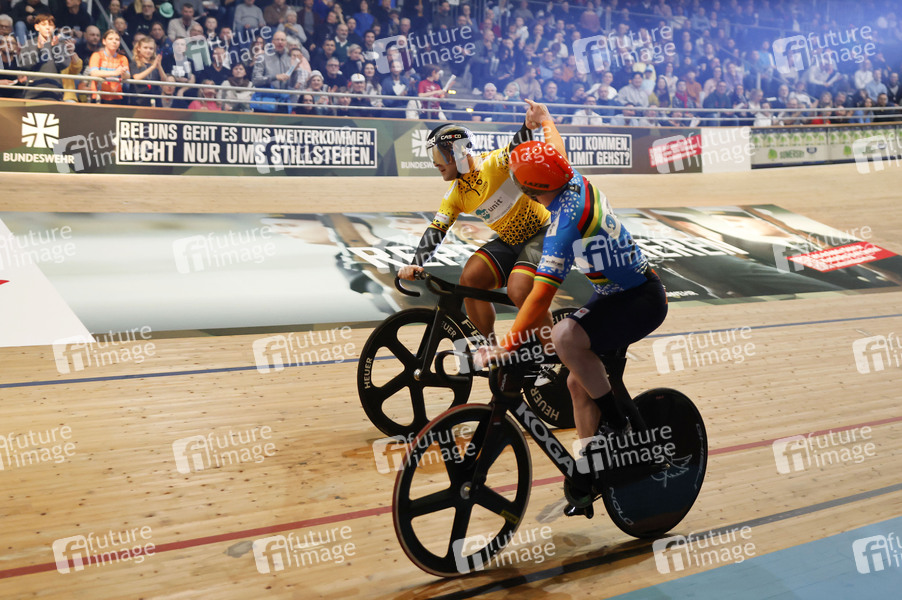 Roy van den Berg (NED) und Robert Förstemann (GER) nach dem Keirin beim Sixdays Weekend 2025 im Velodrom. Berlin, 01.02.2025