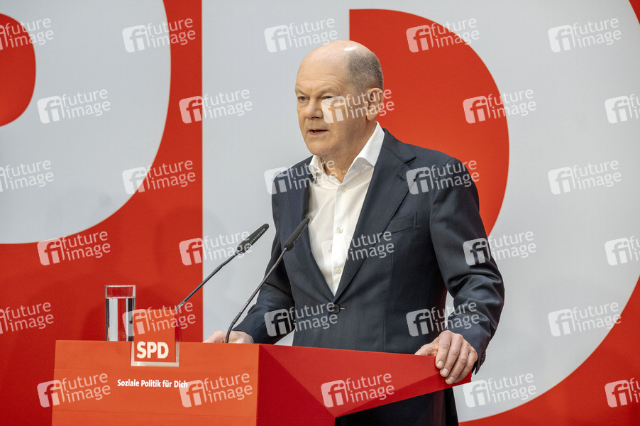 Olaf Scholz bei einer Pressekonferenz der SPD zu den Bundestagswahlen im Atrium des Willy-Brandt-Hauses. Berlin,24.02.2025