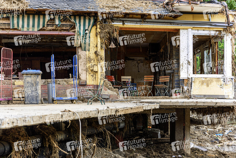 Nach dem Jahrhunderthochwasser in der Eifel durch heftige Regenfälle und Dauerregen mit Überschwemmungen und Überflutungen haben die Aufräumarbeiten im Ahrtal große Fortschritte gemacht. Einheiten von Polizei, THW, Bundeswehr und Feuerwehr mitsamt vielen freiwilligen Helfern haben Straßen geräumt, Schutt und Schlamm entfernt und die Menschen versorgt. Der Wiederaufbau wird trotzdem Jahre dauern. Im Bild Flutschäden in der Ortschaft Mayschoß, in der die Flut viele Häuser zerstörte, 08.08.2021
