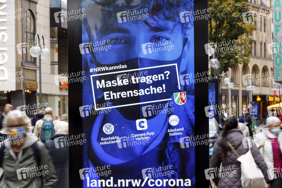 Köln ist weiter Corona-Risikogebiet: Inzidenzwert stieg am Dienstag auf 181,9. Die meisten Veranstaltungen bleiben weiterhin verboten. Geschäfte, Spiel- und Bolzplätze, Schwimmbäder und Fitnessstudios haben aber noch geöffnet. Im Bild eine Kampagne des Landes NRW, die Passanten in der Schildergasse auf die dort geltende Maskenpflicht in Fußgängerzonen und die Corona-App hinweist. (Themenbild, Symbolbild) Köln, 26.10.2020