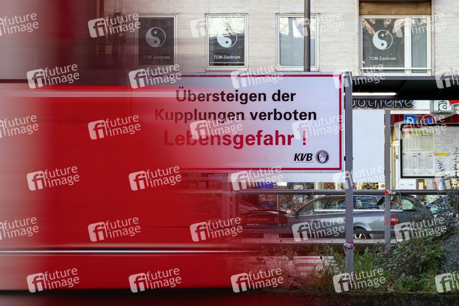 Lebensgefahr, Gefahr, Warnhinweis, Verbot, Verbotsschild, klettern, KVB, Kölner Verkehrsbetriebe, Zug-Kupplung, Bahn-Kupplung, mitfahren, S-Bahn-Surfing, Bahn, Bahnen, Unfall, Tod, Gleisunfall, Schienenunfall, Personenschaden, Kupplung, Kupplungen, Übersteigen, verboten, Übertreten der Gleise, Überqueren der Gleise, Eingriff in den Schienenverkehr, Gleisbett, Schienen, Bahnschienen, Toter Winkel, Unfall am Gleis, Gefahr am Bahnübergang, Rotlichtverstoß, Bahnsuizid, Schienensuizid, Warnhinweis, Schienentote, Tödlicher Unfall am Bahnübergang, Schienenunfall, Schienentod, Straßenbahn, U-Bahn, Zugfahren, Bahnfahren, Schienenverkehr, Haltestelle, Gleis, Notarzteinsatz am Gleis, Selbstmord am Gleis, Sicherheit, Pendler, Verkehrsbund, Verkehrsmittel, Bahnübergang, Bahnfahrer, Bahnschienen, Notbremse, Warnhinweis für Fußgänger, Gefährlicher Eingriff in den Bahnverkehr, Tram, Wagenkupplung, mitfahren, Symbolbild, Symbolfoto