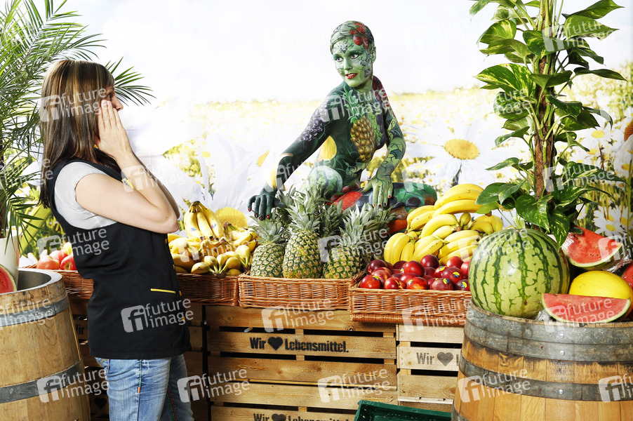 WORKING ART ist eine Bilderserie des Künstlers Jörg Düsterwald und des Fotografen Tschiponnique Skupin. Dabei werden Berufe mit der künstlerischen Bildsprache der Körpermalerei neu dargestellt. In den Schaffensprozess werden reale Unternehmen und authentische Locations eingebunden, um eine Symbiose zwischen Arbeitswelt und Kunst zu schaffen. Hier ein Shooting mit Model Renée-Claire und Obstverkäuferin Carolin im Forum Center. Wolfenbüttel, 26.06.2015