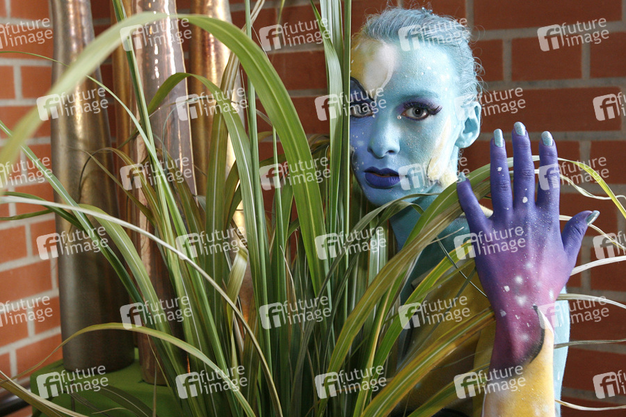 Bodypainting und Fotoshooting mit Model Sarah am Tag der offenen Tür der Meisterschule Justus-von-Liebig-Schule, Abteilung Floristik in Hannover-Ahlem. Künstler: Jörg Düsterwald