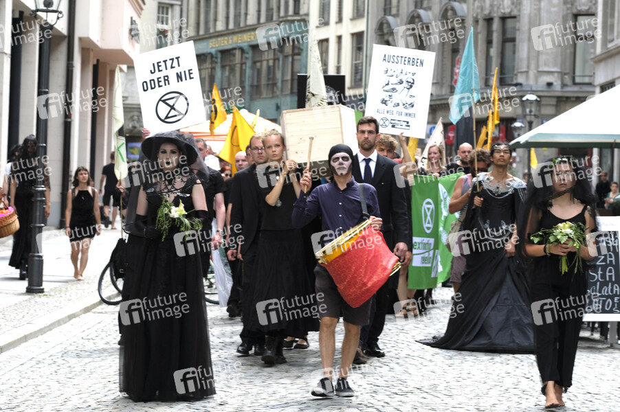 Besucher des 28. Wave-Gotik-Treffens und Klimaaktivisten der Klimaschutzbewegung Extinction Rebellion bei einem gemeinsamen Trauermarsch für aussterbende Arten mit anschliessenden Die-In. Leipzig, 10.06.2019