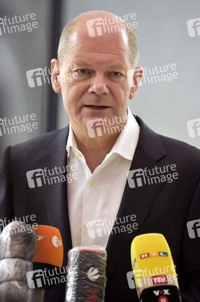 Olaf Scholz bei einem Statement nach einem Unternehmensbesuch bei der Merk KGaA im Innovation Center. Darmstadt, 26.08.2021