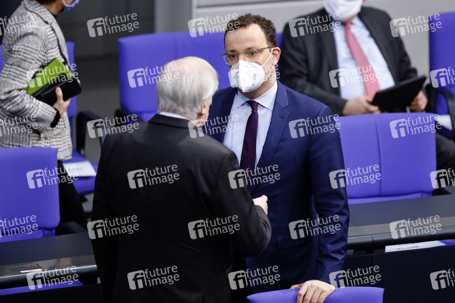 Horst Seehofer und Jens Spahn in der 203. Sitzung des Deutschen Bundestages im Reichstagsgebäude. Berlin, 13.01.2021