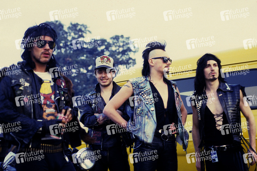 Mark 'Zodiac Mindwarp' Manning, Stephen 'Kid Chaos' Harris, Geoff 'Cobalt Stargazer' Bird und Slam Thunderhide von Zodiac Mindwarp and the Love Reaction auf dem Reading Rock Festival 1986 an der Richfield Avenue. Reading, 24..08.1986