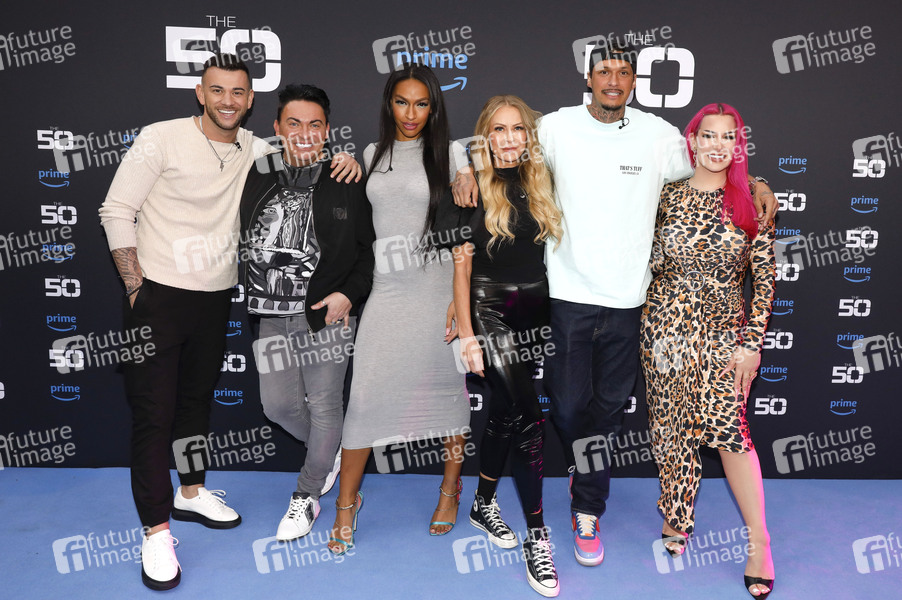 Serkan Yavuz, Matthias Mangiapane, Cecilia Asoro, Jenny Elvers, Yasin Mohamed und Raffa Plastic beim Photocall zur Amazon Prime Video Reality-Show 'The 50' in der Wolkenburg. Köln, 09.04.2024