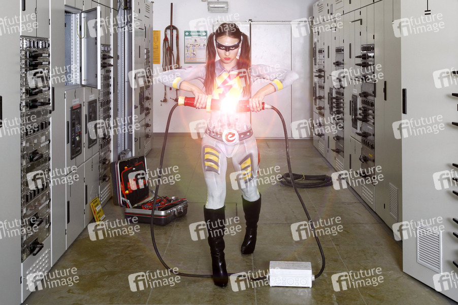 Bodypainting, Body-Painting, Erotik, Frau, Mädchen, nackt, Akt, weiblich, Körperkunst, Körperfarben, Farbe, Bemalung, Kunst, Malerei, drinnen, Strom, Elektrizität, Sicherungen, Stromversorgung, Energieversorgung, Superheld, Superheldin, Energy-Girl, Joerg Dewaldo Duesterwald, body painting, erotic, woman, girl, nude, female, body art, colors, indoors, power, electricity, fuses, power supply, superhero