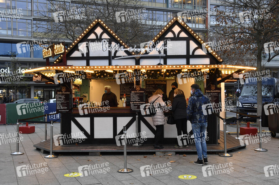 Als Alternative zu abgesagten Weihnachtsmärkten gibt es in diesem Jahr einzelne Stände mit Weihnachtsschmuck und Angeboten wie Glühwein, Mandeln und Bratwurst, hier in der City West am Breitscheidplatz. Berlin, 10.12.2020