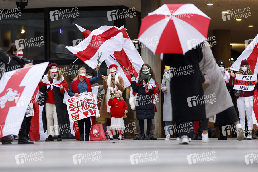 Demonstranten der 'Kundgebung für Demokratie in Belarus' protestieren mit Mundschutz wegen Corona auf dem Roncalliplatz gegen Lukaschenko und das Vorgehen der Regierung in Weißrussland gegen die Opposition. Köln, 22.11.2020