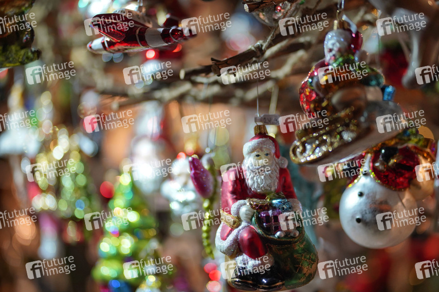 Weihnachtsbaum mit vielen unterschiedlichen Glaskugeln (Weihnachtsmann mit Geschenkesack, Flugzeug, Schneemann) - Der Weihnachtszauber am Gendarmenmarkt findet aufgrund von Bauarbeiten in den Jahren 2022-2024 am Bebelsplatz an der Staatsoper statt. Berlin, 26.11.2022