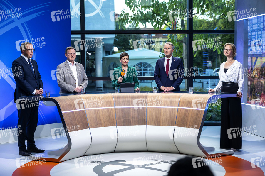 Mario Voigt (CDU), Bodo Ramelow (Die Linke), Melanie Haack (ZDF), Björn Höcke (AfD) und Katja Wolf (BSW) am Wahlabend der Landtagswahl 2024 in Thüringen im Landtag . Erfurt, 01.09.2024