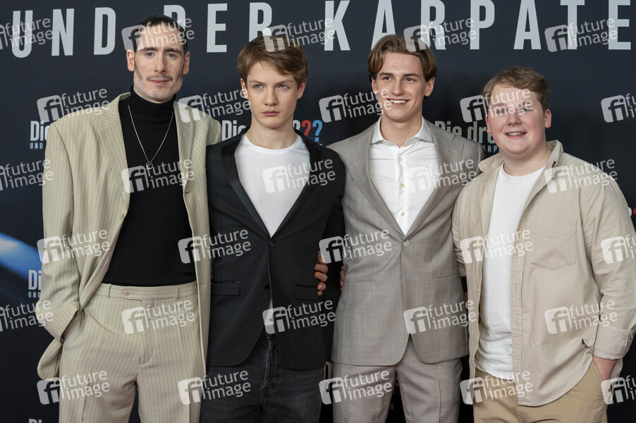Tim Dünschede, Levi Brandl, Nevio Wendt und Julius Weckauf bei der Weltpremiere des Kinofilms 'Die drei ??? und der Karpatenhund' im Mathäser Filmpalast. München, 12.01.2025