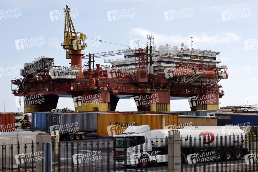Die Floatel Reliance im Hafen von Santa Cruz de Tenerife dient als schwimmendes Hotel. Die als Wohnplattform konzipierte Halbtaucherinsel von Floatel International Ltd. trägt die Flagge Bermudas und dient gewöhnlich bis zu 500 Arbeitern einer Ölbohrinsel als 'schwimmendes Hotel', das unter anderem über eine Krankenstation, ein Kino, ein Fitnessstudio und einen Hubschrauberlandeplatz verfügt. Santa Cruz de Tenerife, 24.11.2021