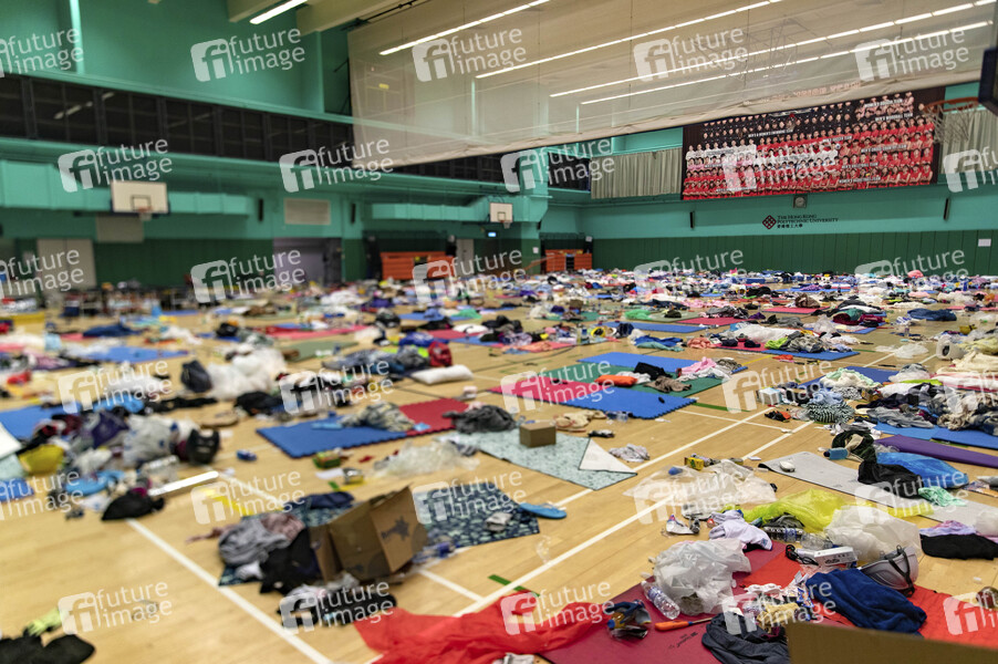 Eine Sporthalle auf dem Campus dient als Schlafgelegenheit - Belagerung an der Polytechnischen Universität. Die Polizei umstellt den Campus der Universität, nachdem Demonstranten den Cross-Harbor-Tunnel und die Hauptstraße außerhalb des Campus blockiert haben. Hongkong protestiert seit fünf Monaten ununterbrochen. Am Montag, dem 11. November 2019, begann ein Streik in der ganzen Stadt, der Teile von Hongkong zum Erliegen brachte, als MTR-Stationen geschlossen und mehrere Straßensperren errichtet wurden. Hongkong, 18.11.2019