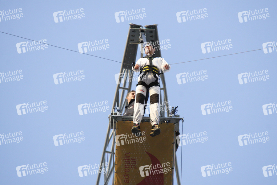 Base Flying von Jochen Schweizer mit den Hauptdarstellern von 'Gangs' auf dem Park Inn Hotel am Alexanderplatz in Berlin