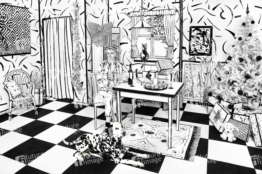 Aus dem FARBKÖRPER Kalender 2026 - Bodypainting Variationen: (Black and) White Christmas Photoshooting mit den Models Tina als Akteurin, Tatjana Heinz getarnt am Bilderrahmen und Hund Diego im Atelier Düsterwald in Hameln als Teil des Projekts Body Art des Fotografen Tschiponnique Skupin und des Bodypainters Jörg Düsterwald.