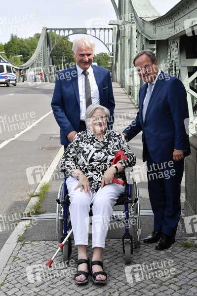 Dieter Dombrowski, Maria von Pawelsz-Wolf und Armin Laschet bei einer Gedenkveranstaltung zum 60. Jahrestag des Baus der Berliner Mauer an der Glienicker Brücke. Potsdam, 13.08.2021