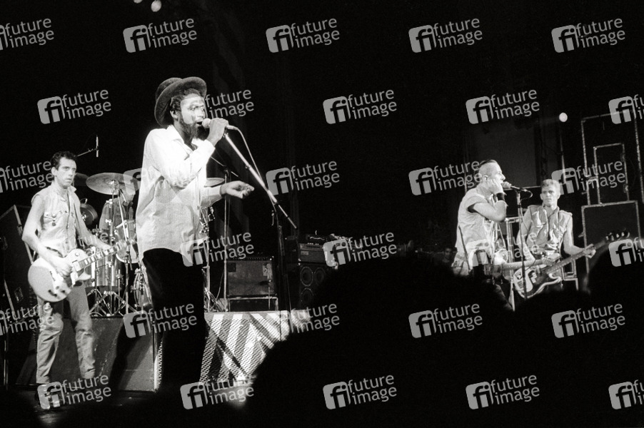 Mick Jones, Terry Chimes, Joe Strummer und Paul Simonon von The Clash mit Gat Don Letts live iim Brixton Fair Deal. London, 30.07.1982