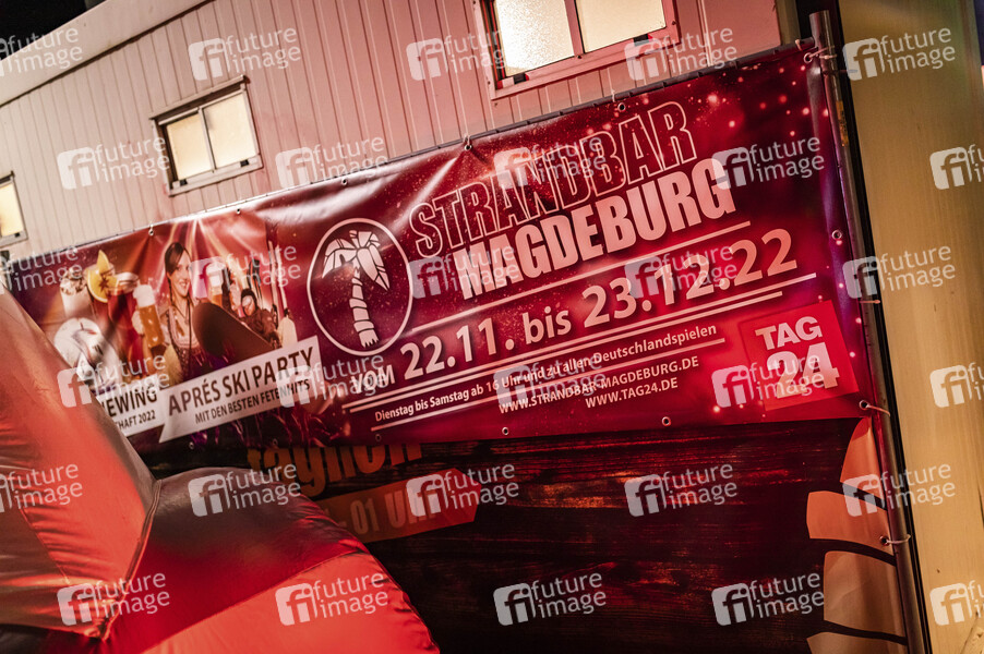 Public Viewing des Nachrichtenportals TAG24 bei der Strandbar Magdeburg. Etwa 70 Fans schauen sich bei 3 Grad Celsius und mit Glühwein die Partie Spanien gegen Deutschland (1:1) der FIFA Weltmeisterschaft 2022 in Katar an. Magdeburg, 27.11.2022