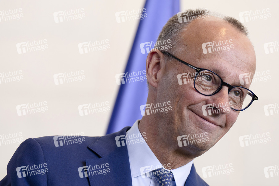 Friedrich Merz beim Empfang des Ministerpräsidenten von Griechenland mit militärischen Ehren und zu einem gemeinsamen Gespräch mit anschließendem Pressestatement im Bundeskanzleramt. Berlin, 13.05.2025
