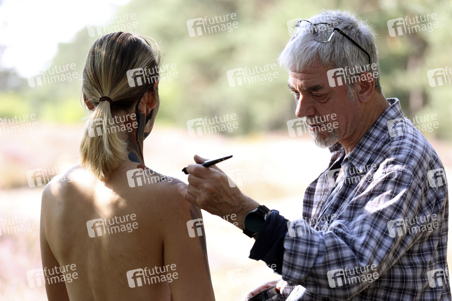 Nature Art: Heidebäume Bodypainting und Photoshooting mit Model Tina in einer Heidelandschaft. Abbensen, 06.09.2024 - Bodyart-Künstler: Jörg Düsterwald
