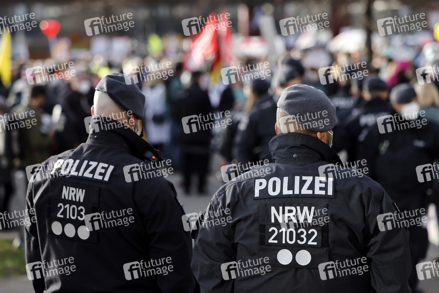 Polizisten bei einer angemeldeten Demo unter dem Motto 'Frieden, Freiheit, Selbstbestimmung - Freie Impfentscheidung'. Wieder demonstrierten etwa 10.000 Gegner einer Impfpflicht mit einem Spaziergang gegen die Corona-Maßnahmen der Bundesregierung und für eine individuelle Impfentscheidung, Grundrechte und 'unversehrte' Kinder - darunter auch viele Pflegekräfte, die wegen der Impfpflicht im Gesundheitsbereich ihren Job zu verlieren drohen. Düsseldorf, 05.02.2022