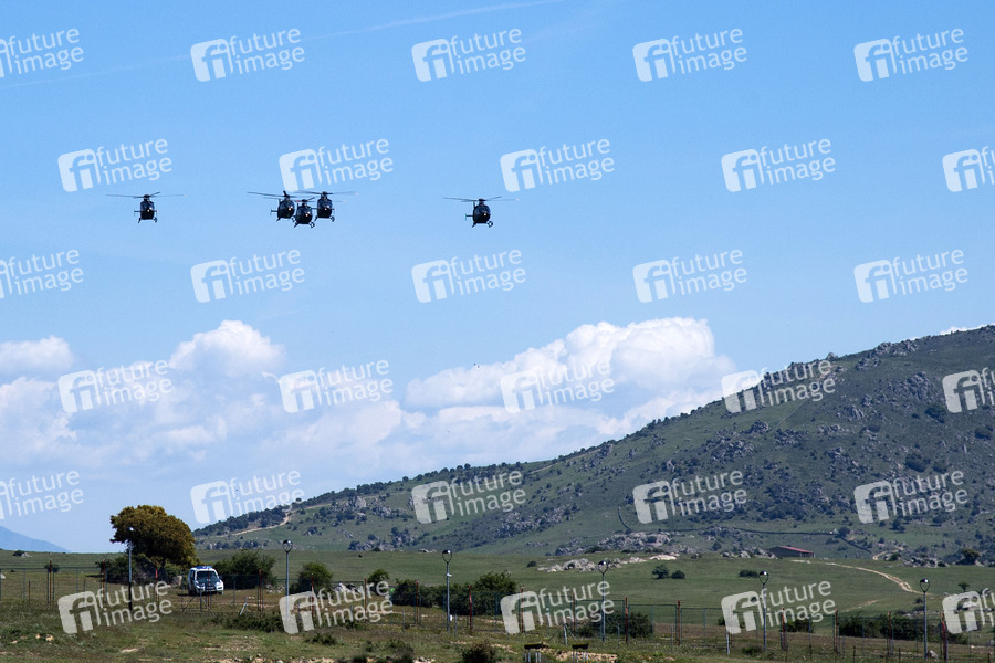 Militärhubschrauber bei der Zeremonie der Übergabe der Nationalflagge an die ACAVIET (Luftfahrtakademie der Armee) in der Helipuerto Base Coronel Mate. Colmenar Viejo, 07.05.2021