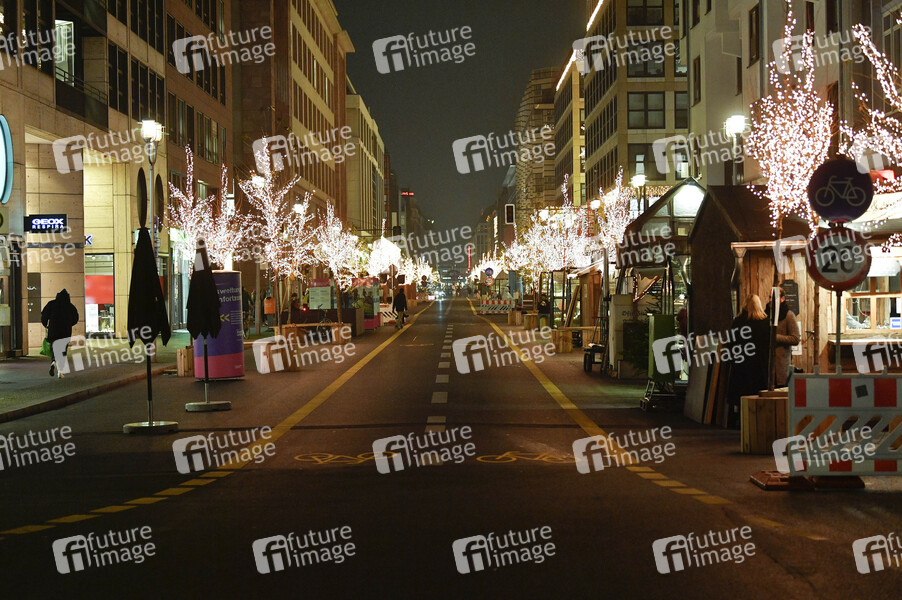 Als Alternative zu abgesagten Weihnachtsmärkten gibt es in diesem Jahr einzelne Stände mit Weihnachtsschmuck und Angeboten wie Glühwein, Mandeln und Bratwurst, hier im autofreien Teil der Friedrichstraße. Berlin, 10.12.2020