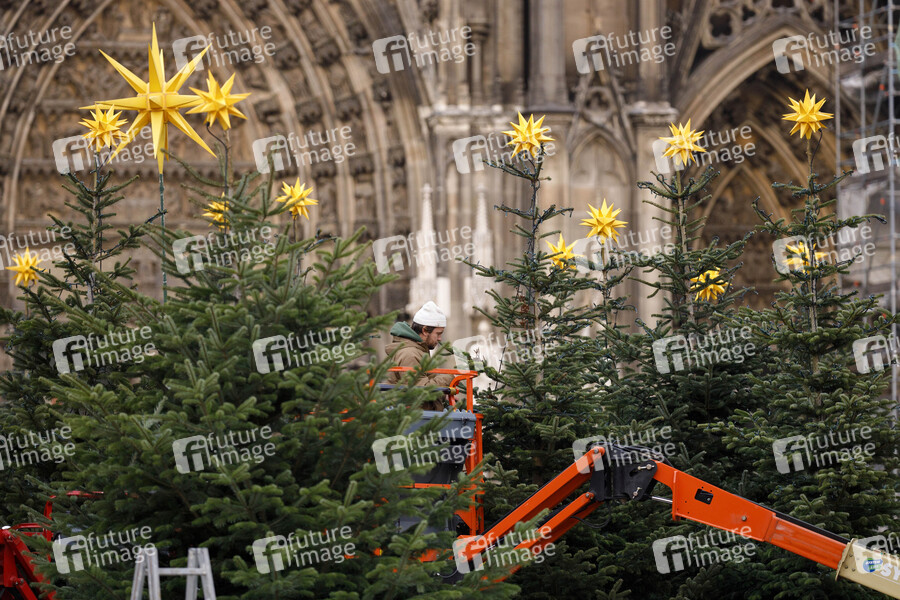Mit Hebebühnen bringen Fachleute Lichterketten an den Weihnachtsbäumen auf dem Roncalliplatz an. Köln, 26.11.2020