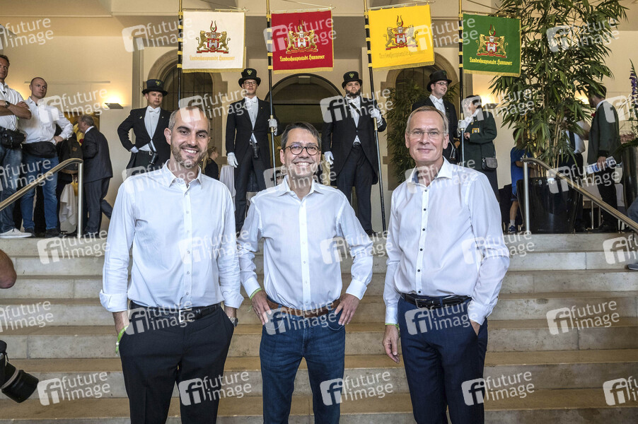 Doe Oberbürgermeisterkandidaten Belit Onay (Bündnis 90 / Die Grünen), Marc Hansmnn (SPD) und Eckardt Scholz (CDU) beim Schützenausmarsch vom 490. Schützenfest. Hannover,30.06.2019