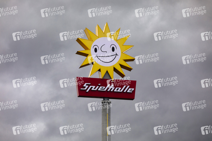 Die sogenannte Merkur Sonne als Logo einer Spielhalle nahe der Autobahn. Köln, 03.03.2019
