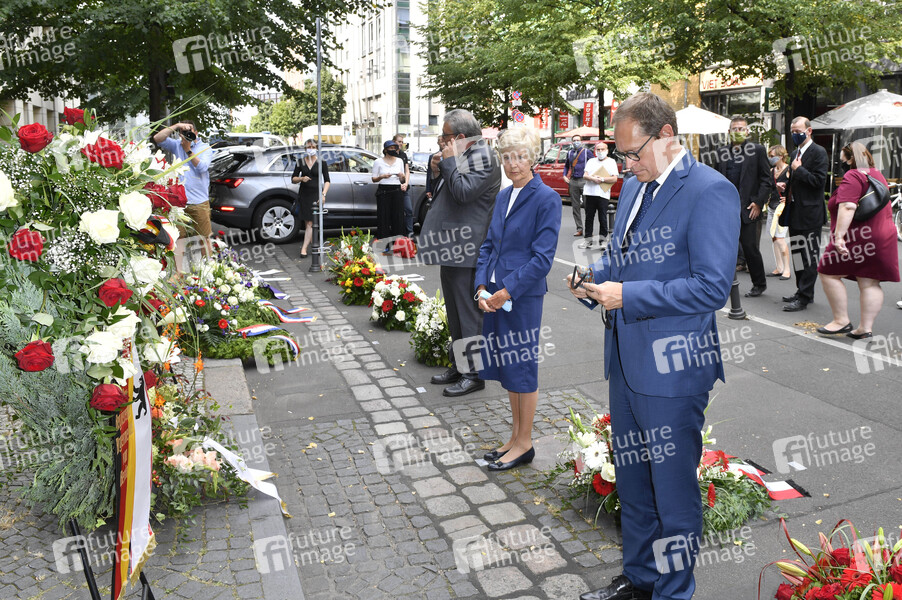 Ralf Wieland, Friede Springer und Michael Müller bei der Kranzniederlegung zum Jahrestag des Baus der Berliner Mauer an der Peter-Fechter-Gedenkstele in der Zimmerstraße. Berlin, 13.08.2020
