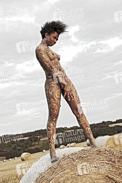 Bodypainting, Erotik, Frau, Mädchen, Afrikanerien, nackt, draußen, weiblich, Körperkunst, Kunst, Ornamente, Malerei, Feld, Acker, Stoppelfeld, Heuballen, Stroh, Landwirtschaft, Ernte, Abendsonne, erotic, African woman, girl, nude, outdoor, female, body art, body painting, ornaments, field, hay, straw, farming, harvest, evening sun