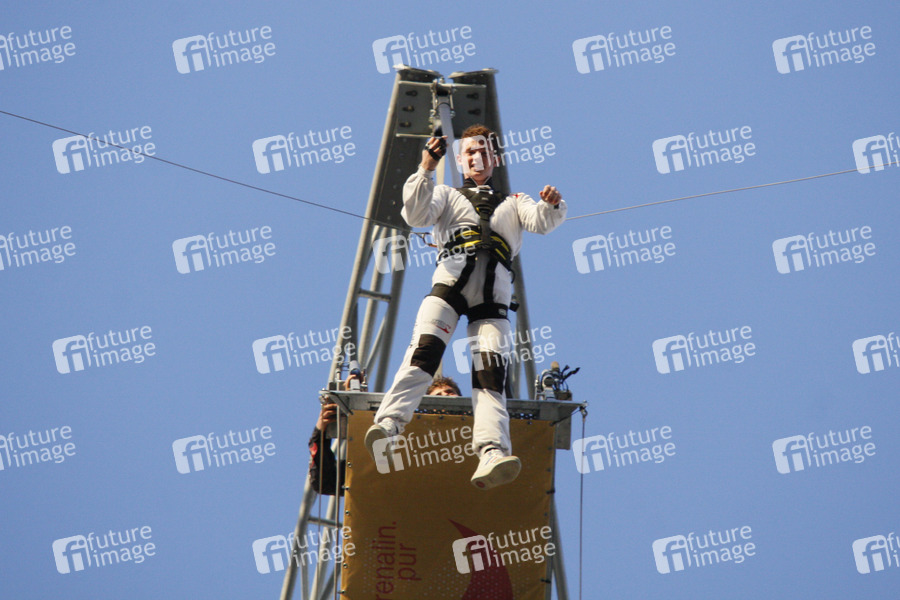 Base Flying von Jochen Schweizer mit den Hauptdarstellern von 'Gangs' auf dem Park Inn Hotel am Alexanderplatz in Berlin