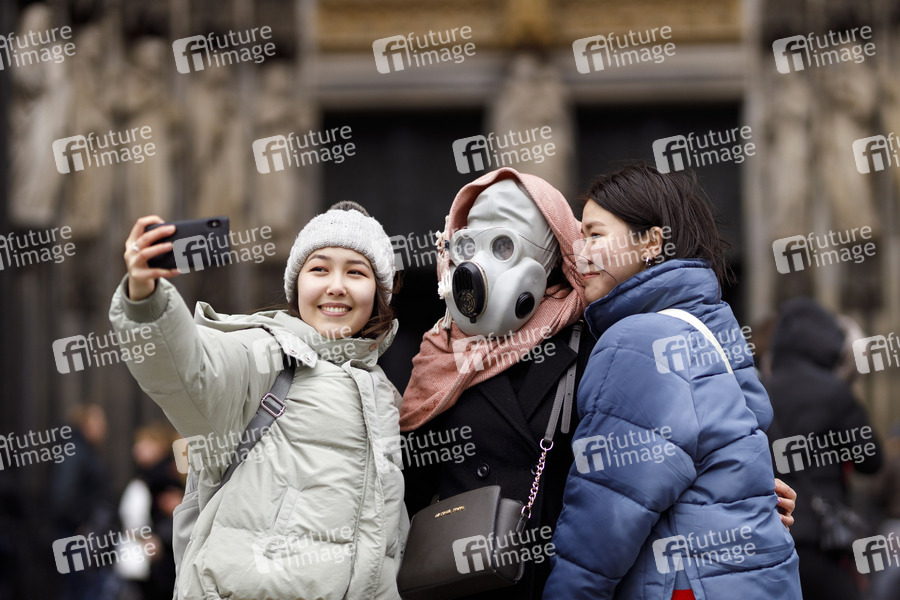 Touristen in Köln, wo nun der erste Coronavirus-Fall von Sars-CoV-2 bzw. Covid-19, bekannt wurde, posieren scherzhaft für ein Selfie mit einer Gasmaske am Kölner Dom. Köln, 29.02.2020