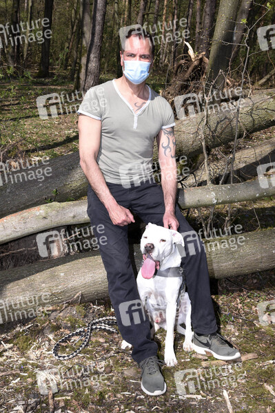 Dave Kaufmann mit seinem Hund Dean Martin bei einem exklusiven Fototerin während eines Spaziergangs. München, 17.04.2020