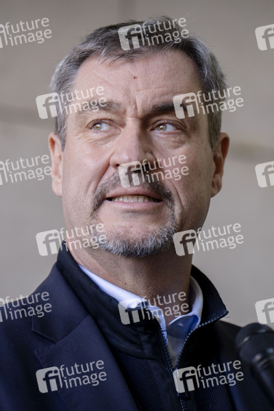 Markus Söder beim gemeinsamen Auftaktstatement der Parteivorsitzenden von CDU, CSU und SPD zur Bildung einer neuen Regierungskoalition im Willy-Brandt-Haus. Berlin, 28.03.2025