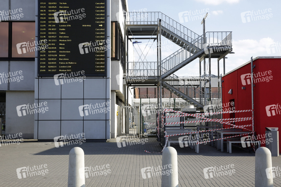 Viele Flugzeuge bleiben am Boden am Flughafen Berlin-Schönefeld. Aufgrund der Corona-Krise sind in Schönefeld die Passagierzahlen eingebrochen. Der Airport ist fast menschenleer. An diesem Mittwoch flog nur eine einzige Ryanair-Maschine nach London. Berlin, 01.04.2020