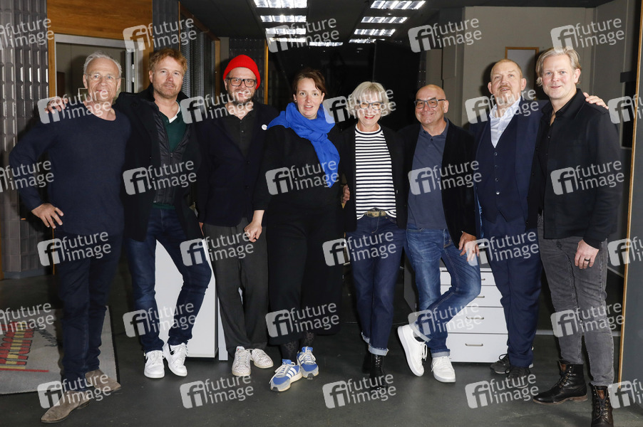 Klaus J. Behrendt, Andreas Pietschmann, Gast, Charlotte Rolfes, Eva Zahn, Volker Zahn, Dietmar Bär und Jan Kruse beim Fototermin bei den Dreharbeiten zum ARD-Krimi 'Tatort - Colonius' im Kommissariat-Set in der Max-Planck-Straße. Köln, 26.04.2024