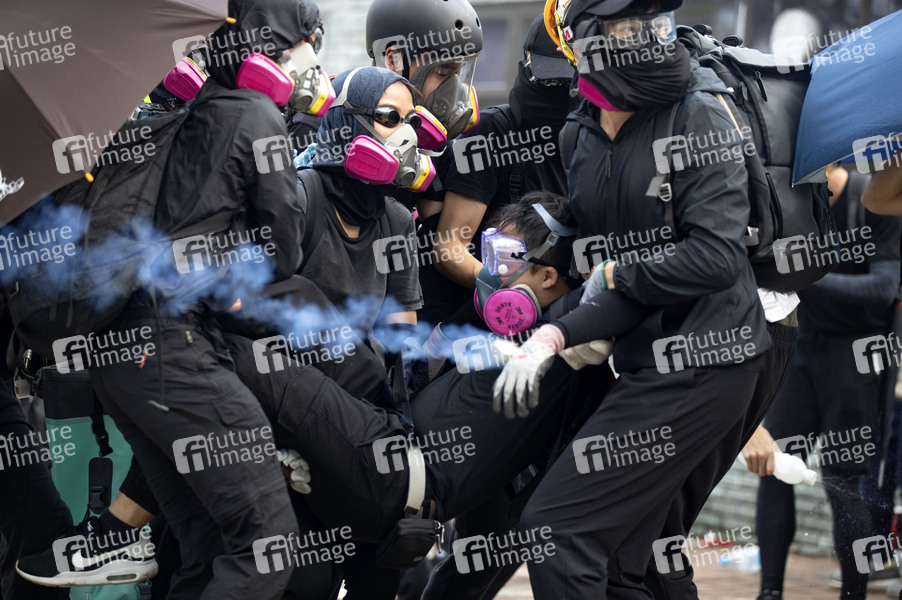 Studenten tragen einen Verletzten durch den Tränengasrauch - Kampf an der Chinese University Hong Kong (CUHK). Hongkong protestiert seit fünf Monaten ununterbrochen. Am Montag, dem 11. November 2019, begann ein Streik in der ganzen Stadt, der Teile von Hongkong zum Erliegen brachte, als MTR-Stationen geschlossen und mehrere Straßensperren errichtet wurden. Hongkong, 12.11.2019